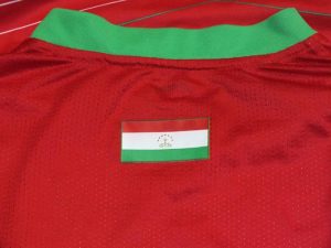 A ver similar design to Switzerland’s 1993 shirt, but with a different pattern in the fabric. This shirt features the FA logo rather than the stylised Lotto logo as the repeating pattern. First used in a friendly against USA on 22/01/94, it was later used at USA ’94. Given the source of this shirt it is more likely that it was worn against Turkey in a Euro ’96 qualifier.