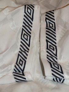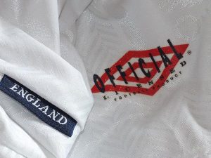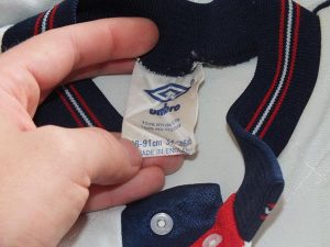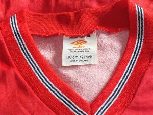 It seems likely that the shirt was worn in a youth (or women’s?) game since the shirt has been stitched at the sides to make it smaller.