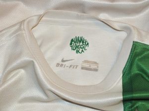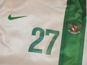 This shirt is clearly matchworn by U23 player Nelson Alom, who must have changed his number at some point. A quick google finds photos of him playing in 27 and 20, but not the 17 that is visible beneath. The shirt features player issue detailing, and a nice touch with the Indoensia FA badge on the lettering – that can’t be easy to come across.