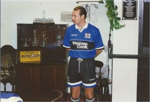 Jimmy Quinn models a prototype of the 1998/99 home shirt at the Great Northern Hotel.